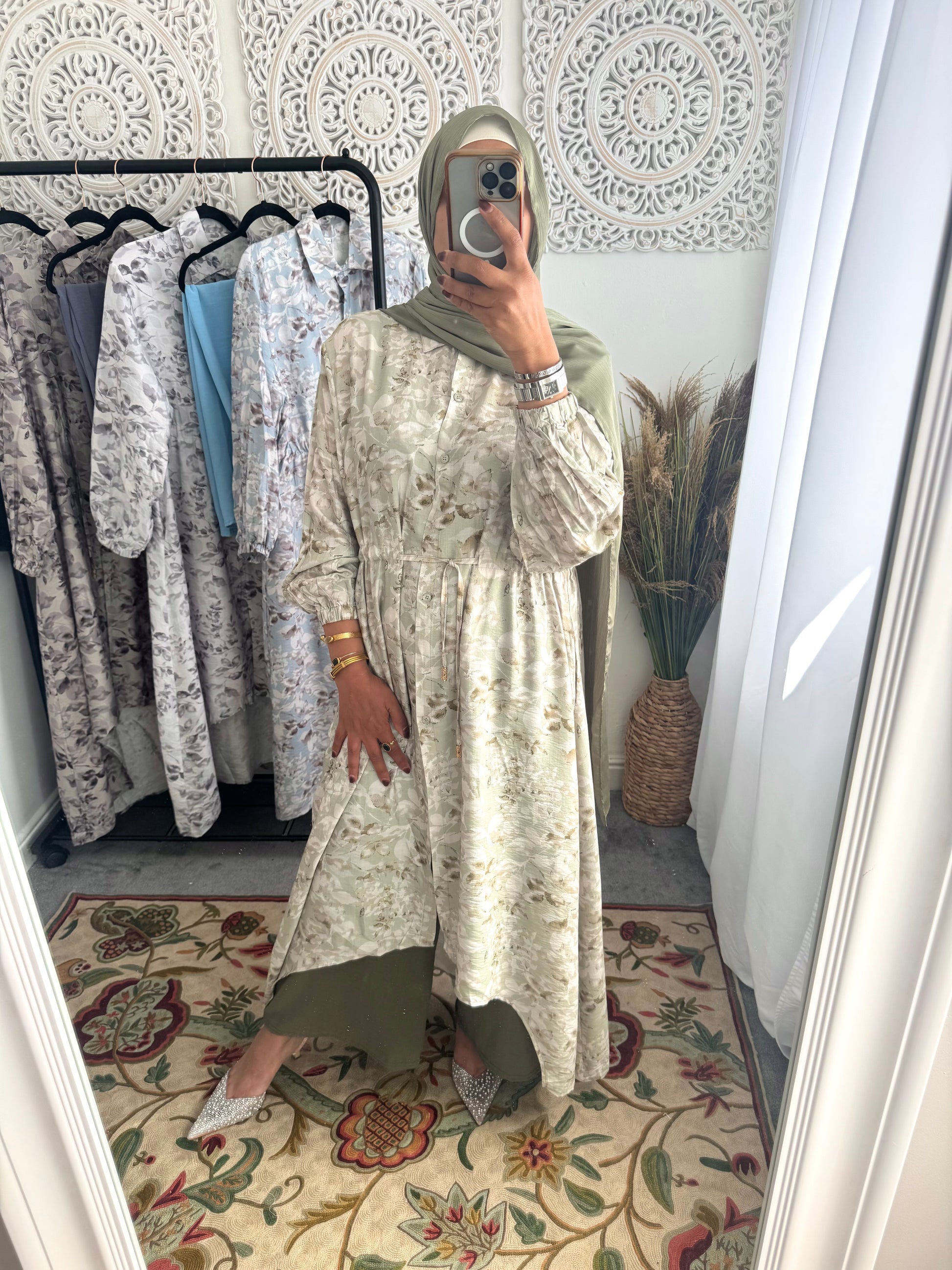 This elegant A line style cord set features a flattering silhouette with a longer back hem for added flow and modesty. The top comes with elasticated sleeves, side pockets, and a waist belt that can be worn or removed for versatile styling.